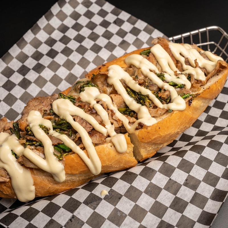 Thinly sliced roast pork, broccoli rabe, caramelized onions, provolone, dijonnaise