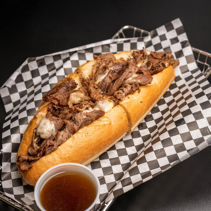Slow roasted Black Angus Beef, caramelized onions and Swiss with a Porter au jus dipping sauce