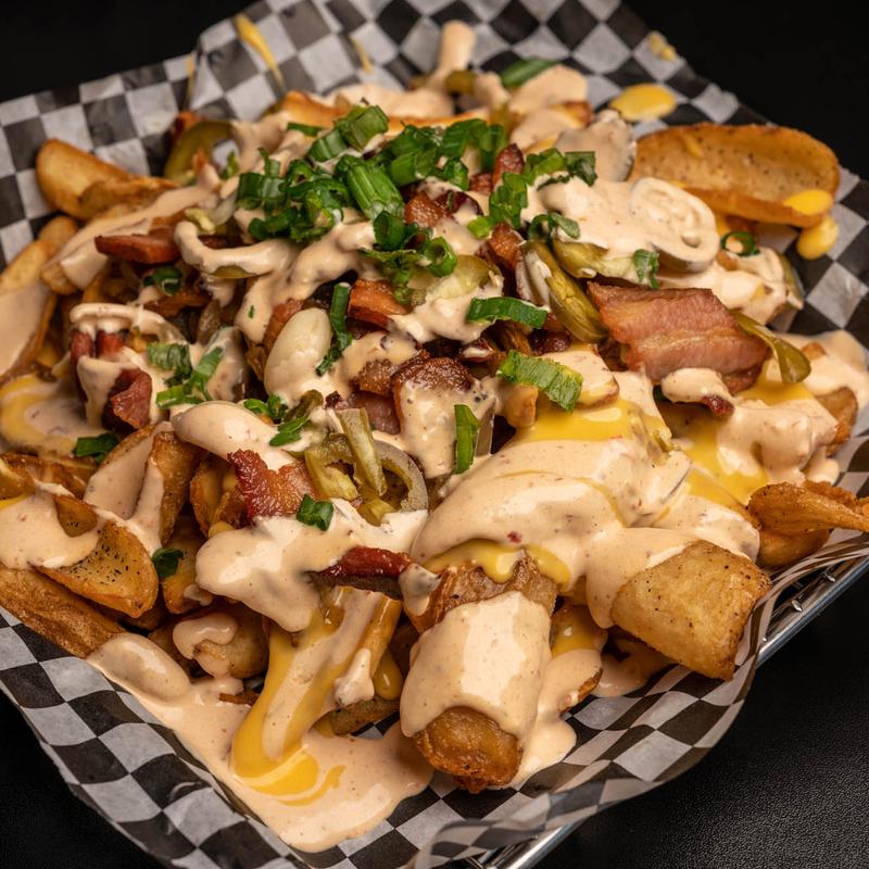 Smoked pork belly, caramelized onions, green onion, jalapeños, roasted garlic, beer cheese sauce, chipotle ranch. You can add an Avocado and/or a fried egg